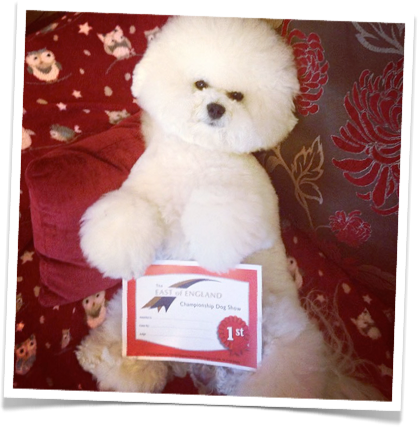 Our young Bichon Frisé boy Arthur won a first place at his first championship dog show at the East Of England in July.